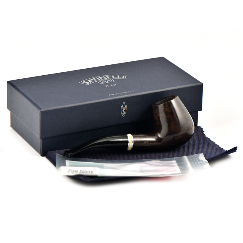 Историческое имя в линейке, Savinelli сделали рустованную и гладкую коричневую отделку с бежевым кольцом и черным акриловым мундштуком.
