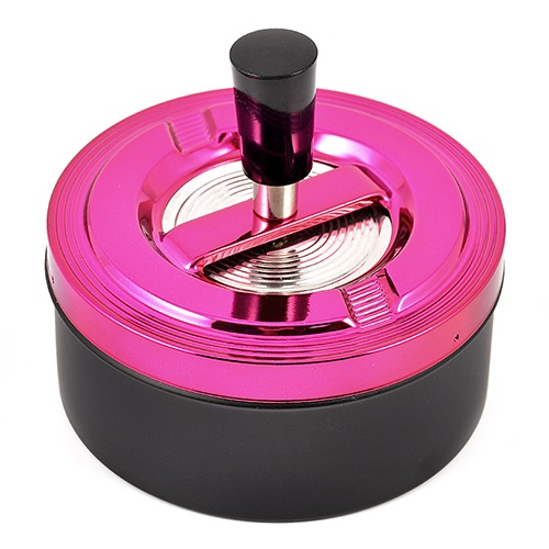 Пепельница металлическая, при нажатии на ручку, верхняя пепельница опускается с одновременным вращением и за счёт центробежной силы освобождается от пепла и окурков, которые попадают в нижнюю более вместительную пепельницу.