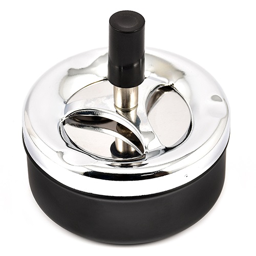 Пепельница металлическая, при нажатии на ручку, верхняя пепельница опускается с одновременным вращением и за счёт центробежной силы освобождается от пепла и окурков, которые попадают в нижнюю более вместительную пепельницу.