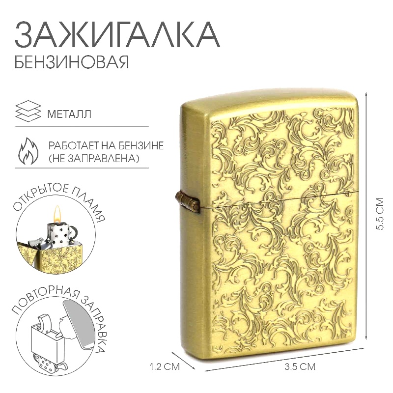 Классическая бензиновая зажигалка станет отличным подарком на день рождения, профессиональный или любой другой праздник. Удобная откидывающаяся крышка, стильный корпус из высокопрочной стали, кремниевый тип поджога - такой аксессуар удовлетворит даже самый взыскательный вкус. Перед использованием зажигалку необходимо заправить бензином.