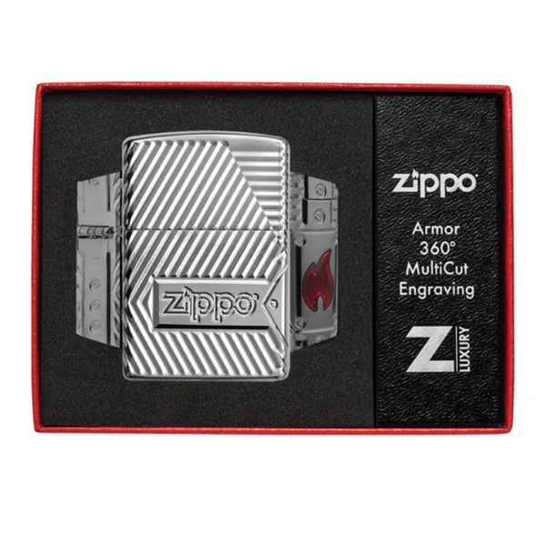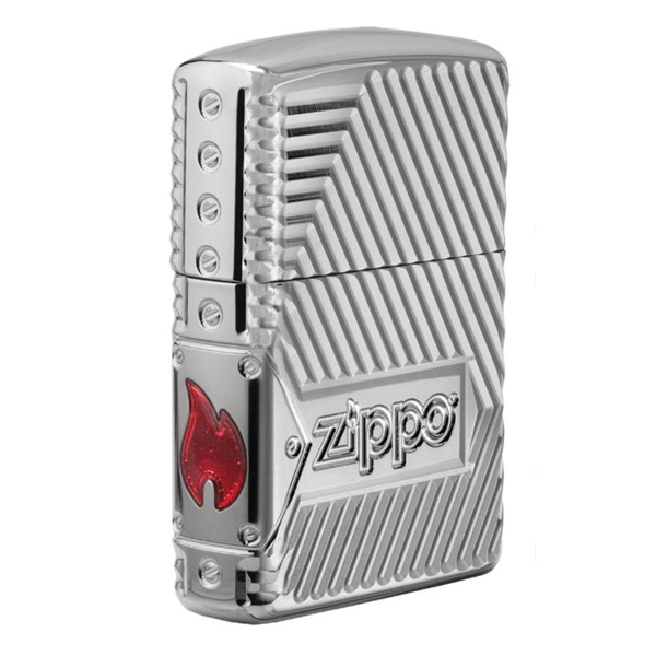 Заклепочная и приковывающая, коронная жемчужина коллекции Choice - ветрозащитная зажигалка Armor ® High Polish Chrome с гравировкой MultiCut на 360° и чистым промышленным дизайном. Пламя Zippo украшает боковую часть зажигалки и заполнено полупрозрачной красной эпоксидной смолой. Роскошная упаковка подчеркивает обернутый дизайн. Для оптимальной работы заправляйте зажигалку топливом Zippo.